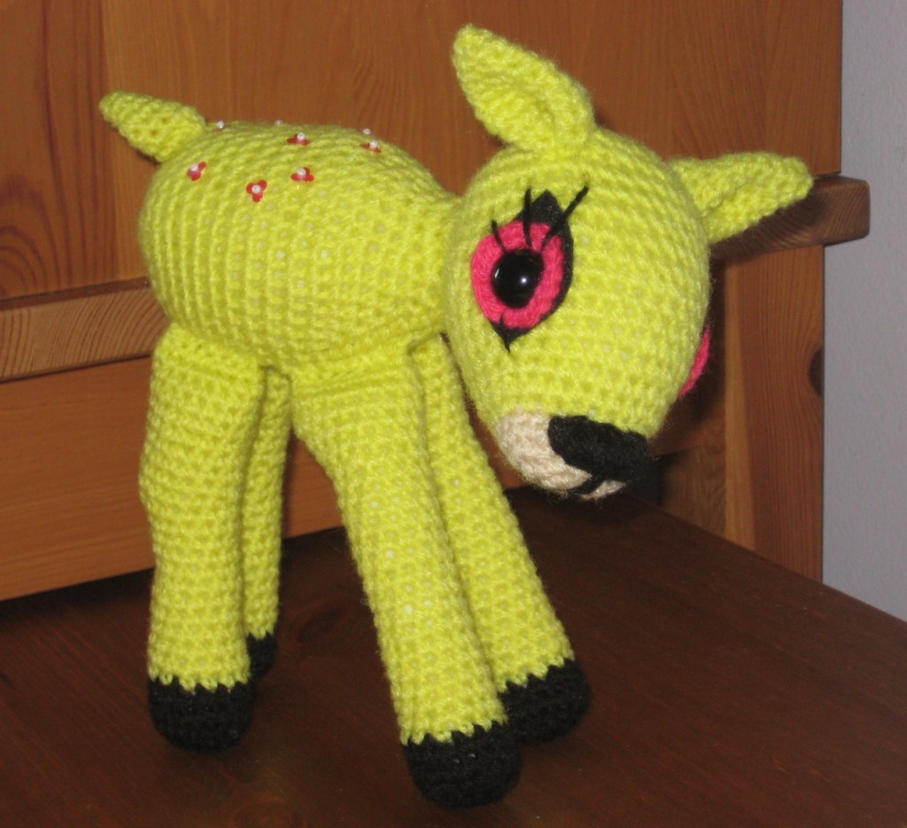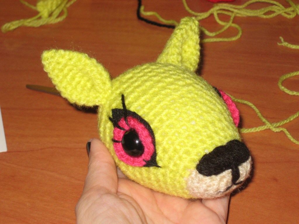 Usé este hilo verde lima con el que tengo una extraña fijación, el mismo que usé para Willow. Es un color muy bonito al que mis fotos no hacen justicia. Bordé el morro del animal, en lugar de usar la nariz «pelota» que indica el libro, y no añadí pesos al rellenar,tan sólo una canica en cada pata, y el muñeco se mantiene bien en pie.