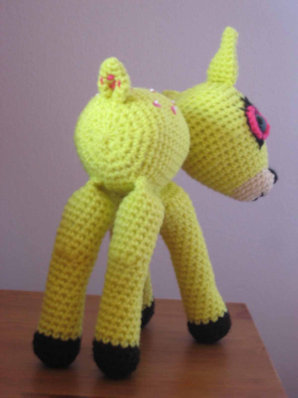 Usé este hilo verde lima con el que tengo una extraña fijación, el mismo que usé para Willow. Es un color muy bonito al que mis fotos no hacen justicia. Bordé el morro del animal, en lugar de usar la nariz «pelota» que indica el libro, y no añadí pesos al rellenar,tan sólo una canica en cada pata, y el muñeco se mantiene bien en pie.
