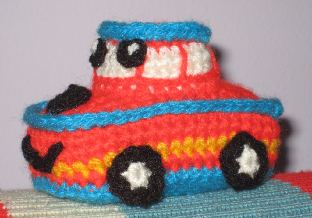 Este patrón es monísimo, aunque es más pequeño de lo que esperaba. No pasa nada, porque es para un niño pequeñito. El patrón es Tiny Wheels Crazee Carz by Christal Friend.