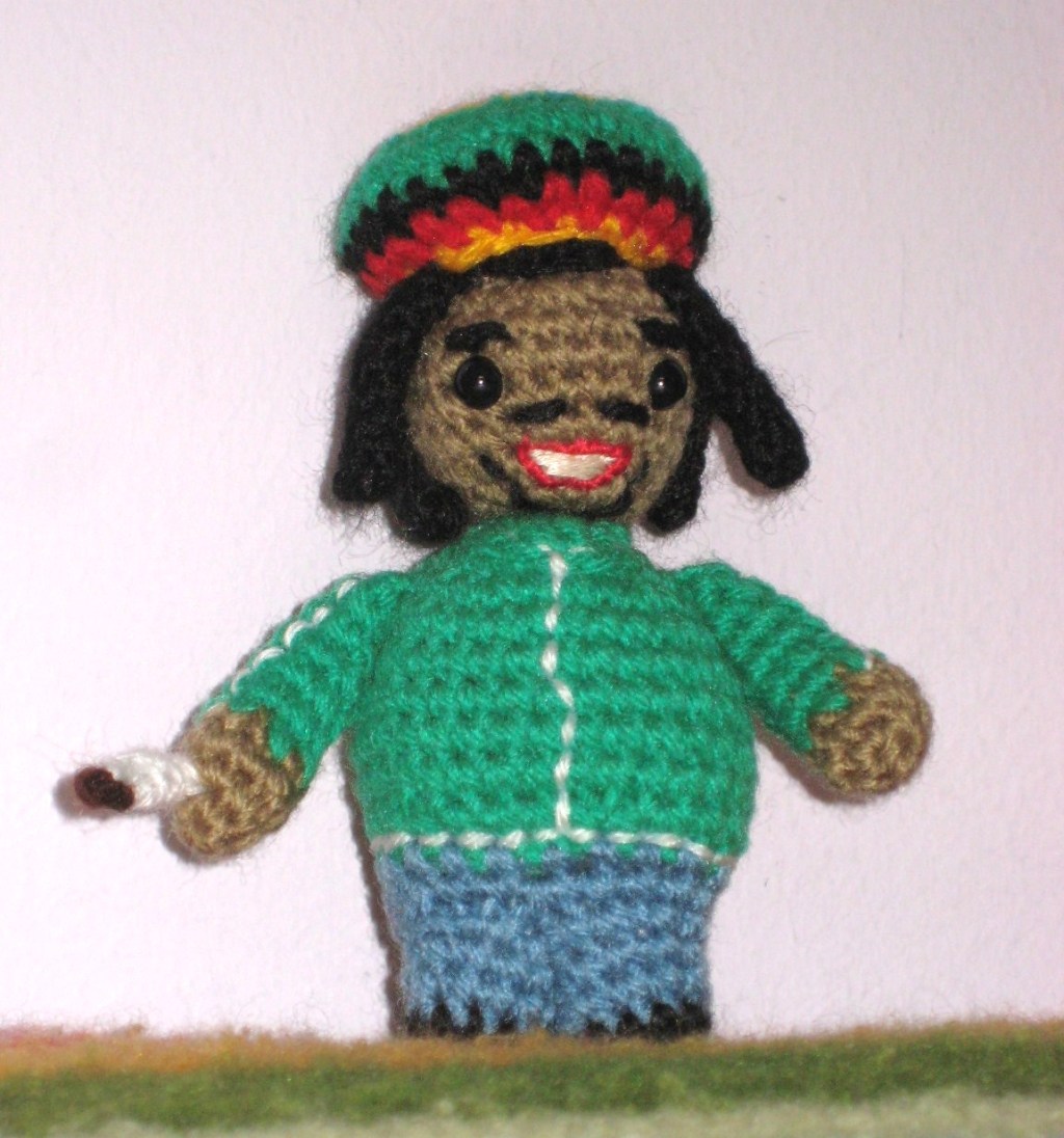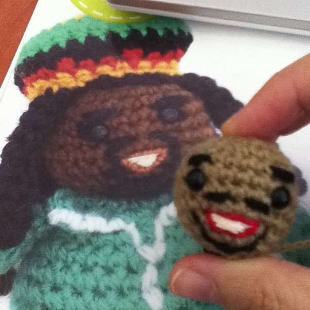 Escogí empezar con el músico rastafari porque quería regalarlo, pero le tengo ganas a otros cuantos… El trabajo de Marisa es muy detallista y se le da muy bien bordar, ¡un rato mejor que a mí!, pero nada, hay que echarle valor y ahí está el resultado: ¡es muy divertido y está teniendo éxito! El patrón es claro y sencillo de seguir, y en el libro hay tutoriales e indicaciones que serán de gran ayuda, tanto a principiantes como a expertos. Hice alguna modificación en el patrón, mi músico soltó el micrófono y se encendió un cigarrito.