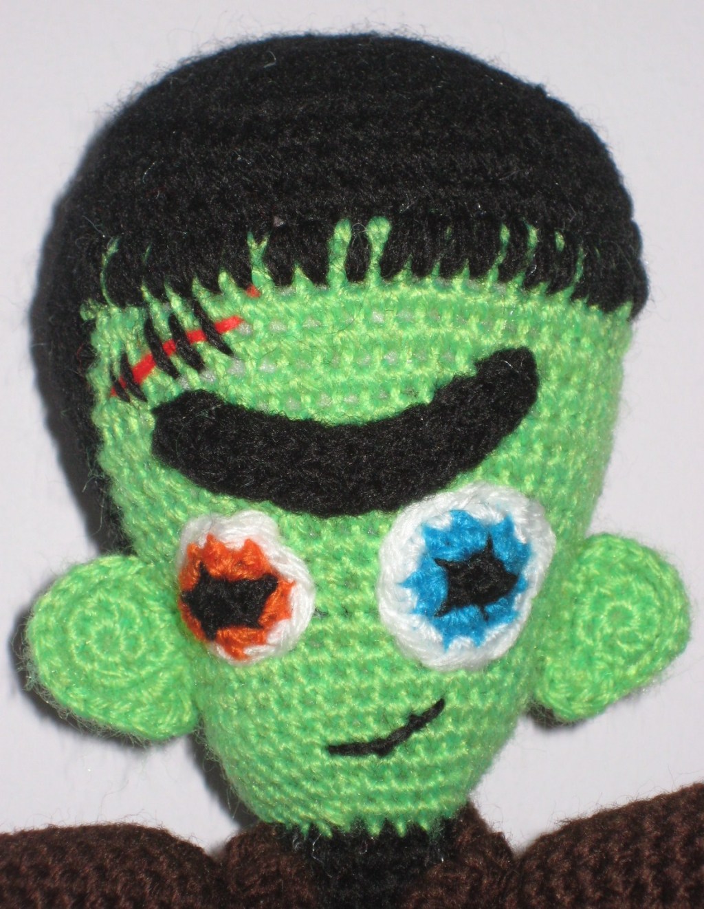 Hace tiempo hice este muñeco, Frankie, una encantadora versión del monstruo de Frankenstein. Me gustó tanto que no lo regalé, y en casa conmigo lo tengo.