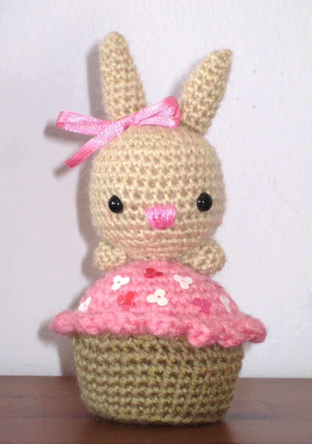 El patrón es Lil’ Bunny Cupcake de Rachel Hoe (aquí en Ravelry). Es muy sencillo y rápido de hacer, y se puede decorar de infinitas maneras.
