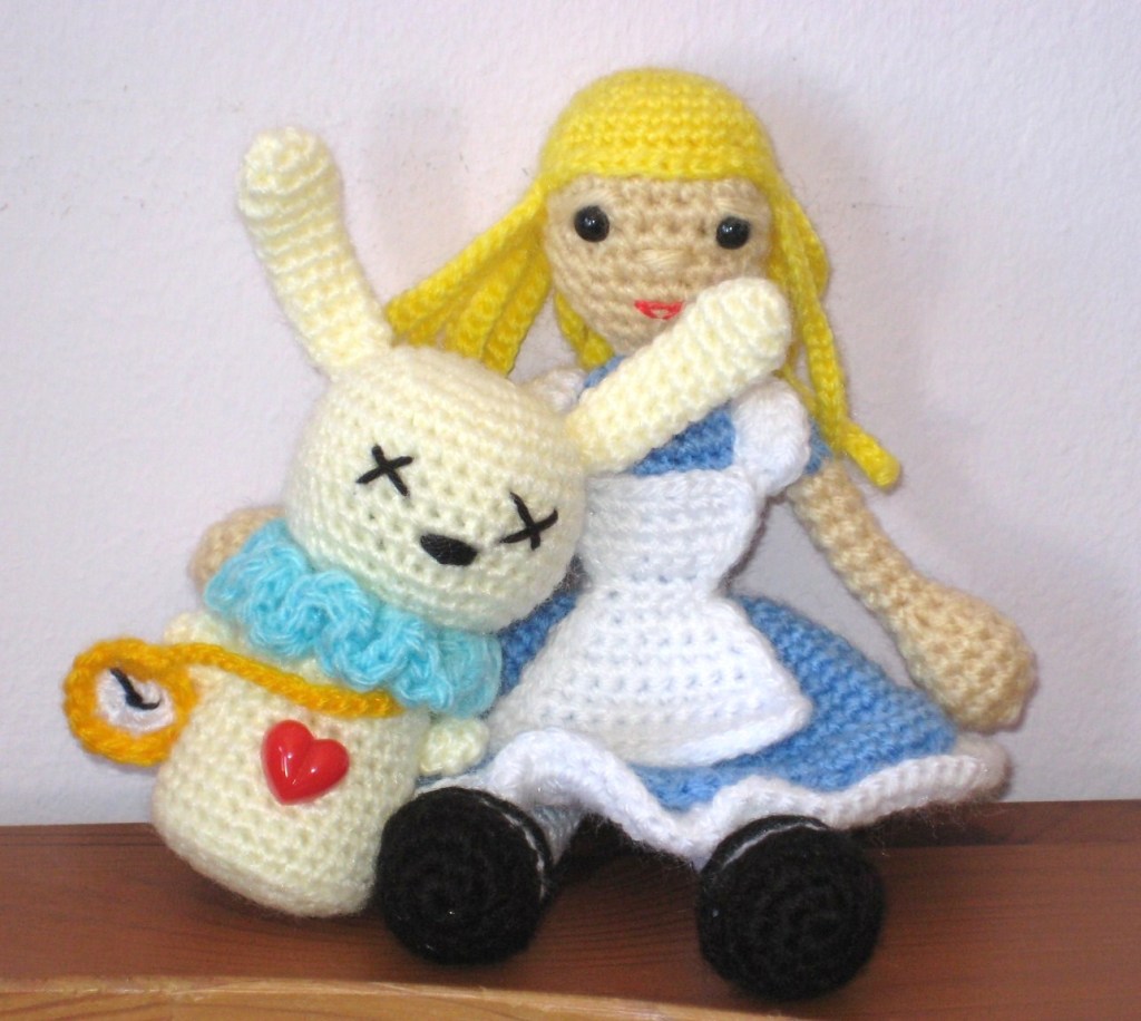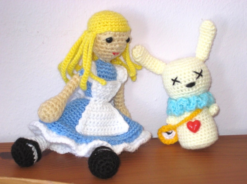 El patrón para Alicia es Alice in Wonderland amigurumi doll by Book People Studio (aquí en Ravelry). Le hice una cabeza más pequeña, y seguí el diseño según la versión de Disney, ya que el patrón tiene otros colores (los de la ilustración de un libro).