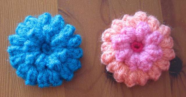 Encontré este patrón (Popcorn Stitch Flower de B.Hooked Crochet) hace un par de días y me pareció muy bonito, así que me decidí a probarlo rápidamente. Es muy fácil de aprender, y muy versátil ya que se pueden variar los colores y el número de pétalos y vueltas, y utilizarlo de muchas maneras. Hice este par de broches que me servirán de improvisados detalles para el Día de la Madre.