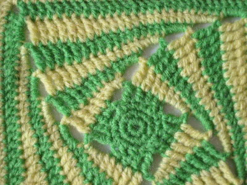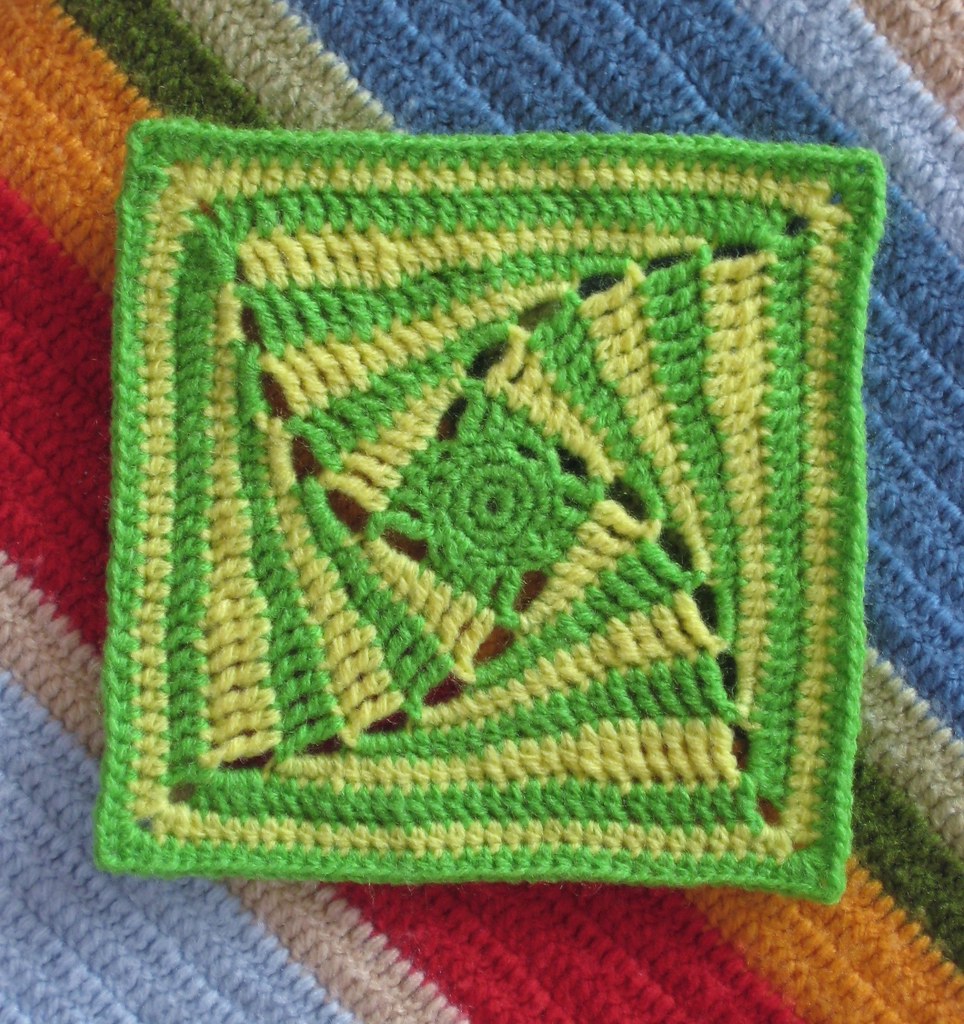 Me puse con este patrón una tarde, para probarlo, y me gusta el resultado, aunque está hecho sin demasiado cuidado, rápido y tiene algún error. El patrón que seguí lo encontré en Pinterest y desconozco su procedencia (si alguien lo conoce puede dejar un comentario). También he encontrado esta versión que es muy parecida: On the Huh Crochet Square (aquí en Ravelry).