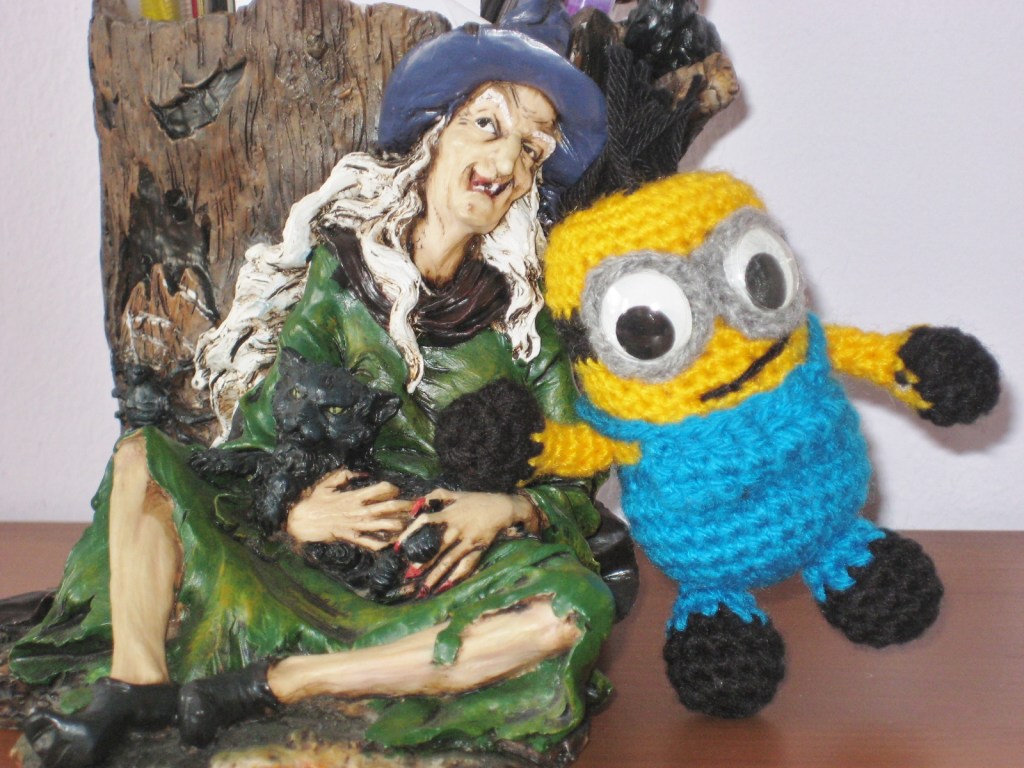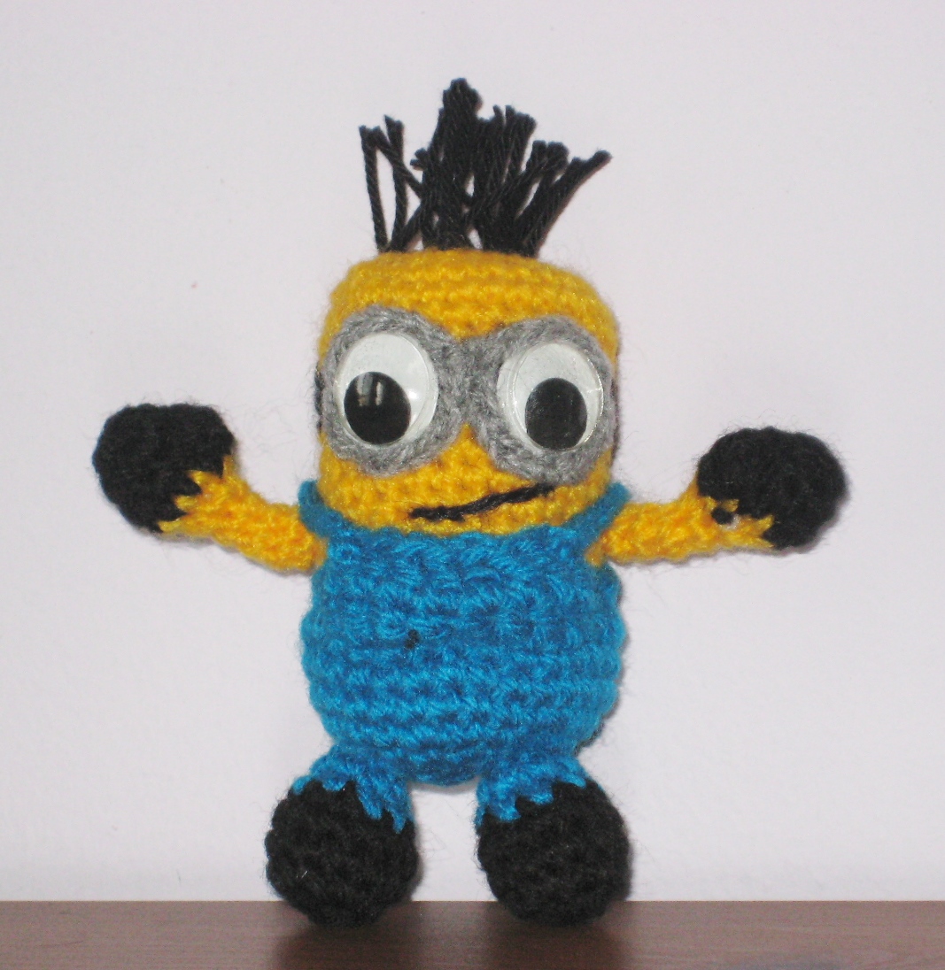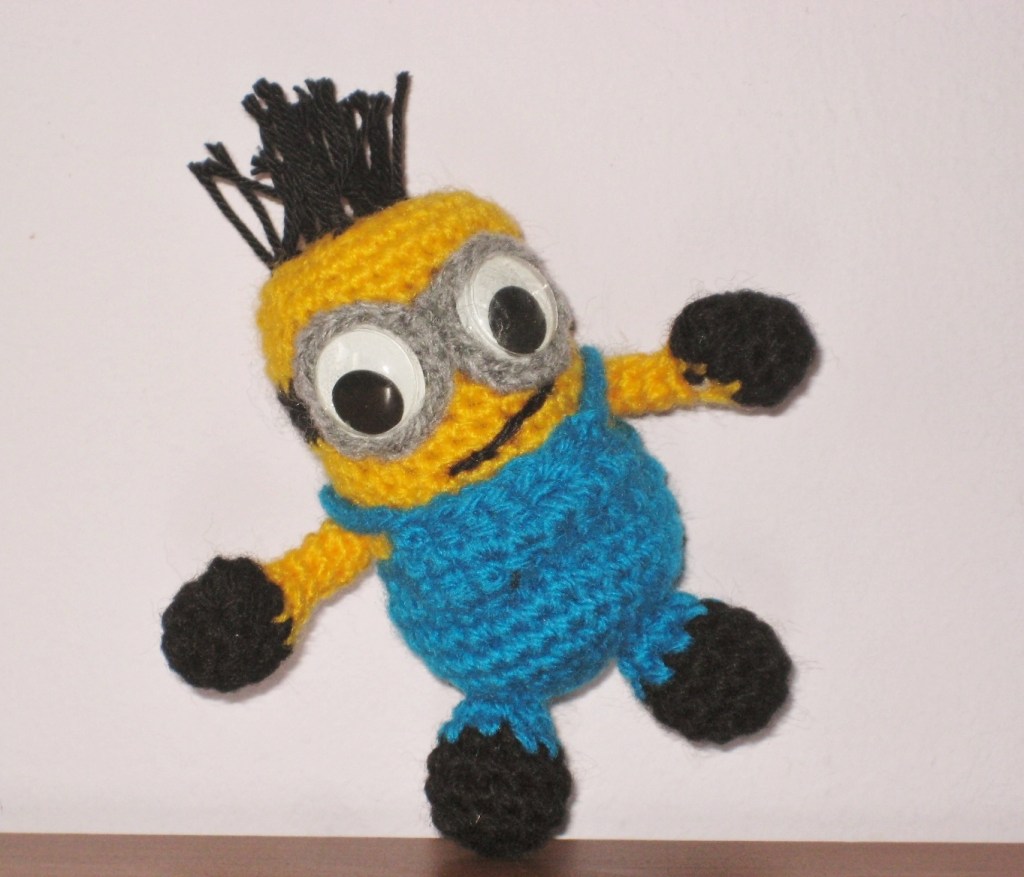 Este es una versión hecha a partir del patrón Minions de Kristen McCrory (aquí en Ravelry). En el patrón hay dos modelos de minions, yo solo hice uno. Lo rellené con un recipiente (más una tapa extra) de los típicos de huevo kinder, con un céntimo dentro para que haga ruido. Es un patrón divertido, fácil y rápido de hacer.