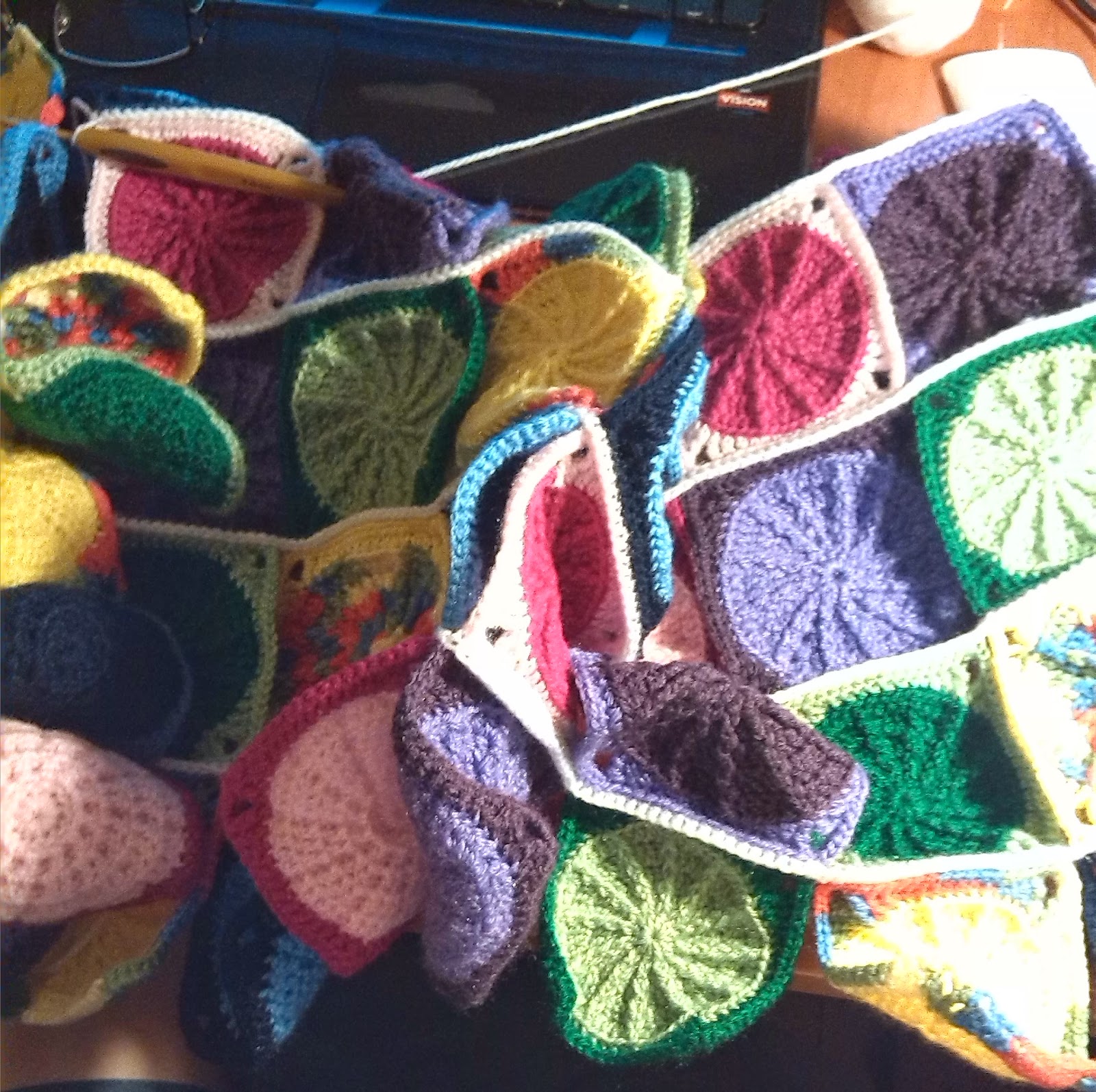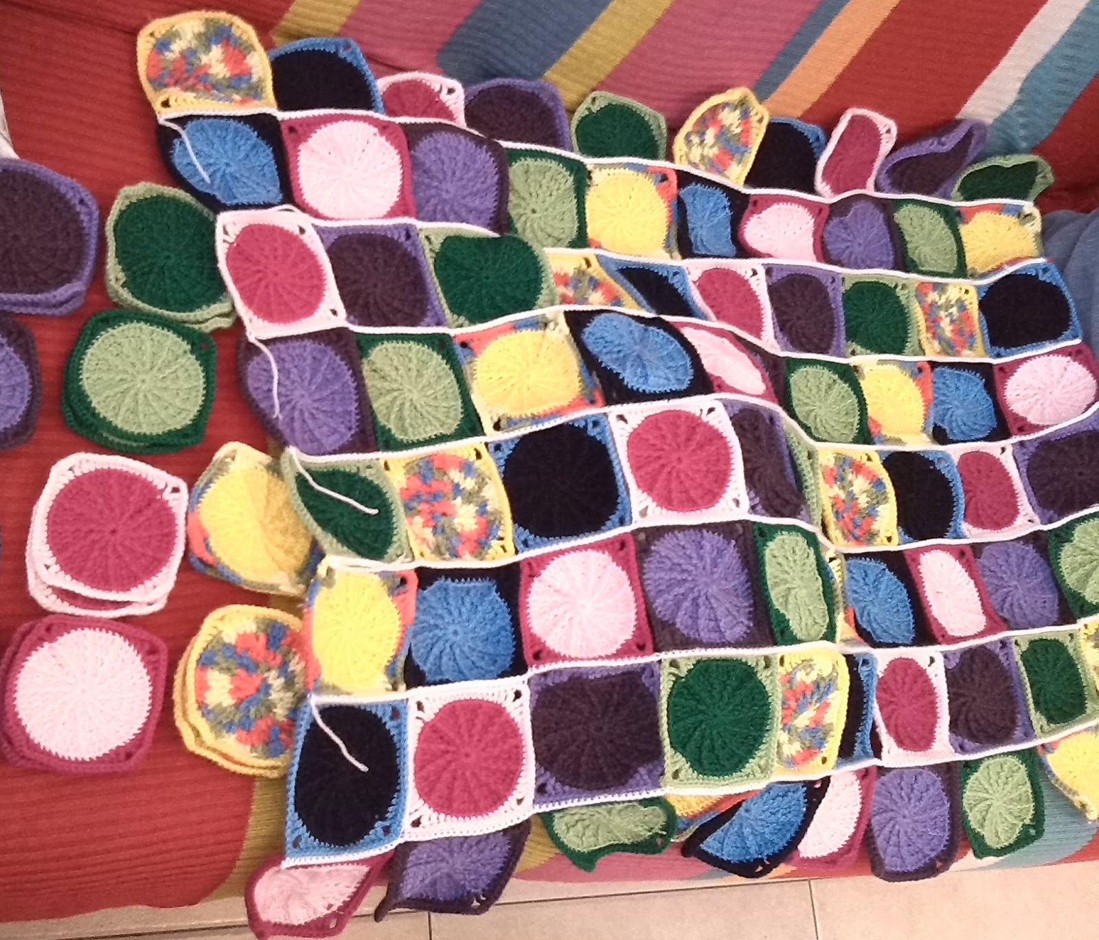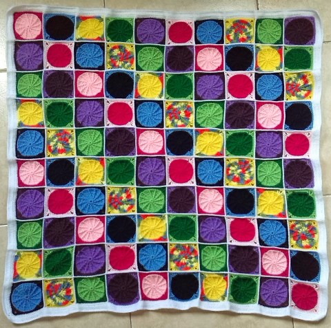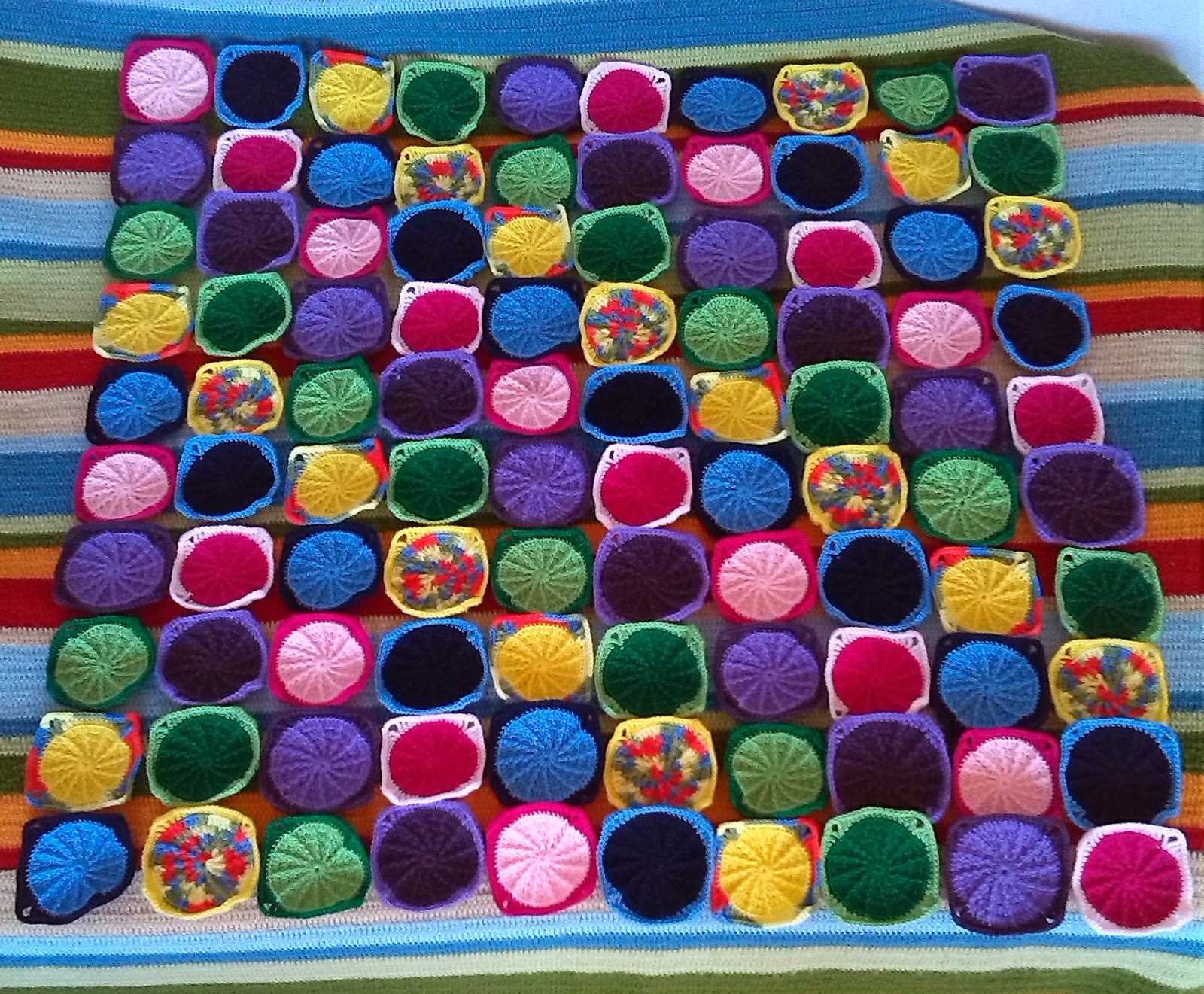 El patrón que he seguido es Sunny Spread de Ellen Gormley, pero el resultado es muy diferente del original. Lo trabajé con hilo acrílico y aguja de 3 mm. Hice un cuadro de 10×10 combinando 10 colores (claros-oscuros), haciendo el círculo interior de un color y el borde de otro. Una vez hechos, los combiné mezclando todos los colores en cierto orden y escogí el blanco para unirlos (con punto bajo) y hacer un borde sencillo, no el que indica el patrón.