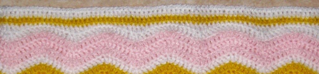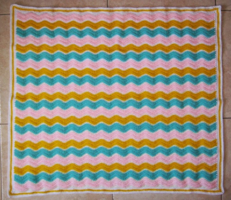 He terminado esta mantita para bebé, mide 77×90 cm. El patrón es un clásico del que hay muchas versiones, yo he seguido esta: Pretty Ripple Baby Blanket de Lauren Brown (aquí en Ravelry) y el borde lo he hecho a partir de estas instrucciones en Attic 24.