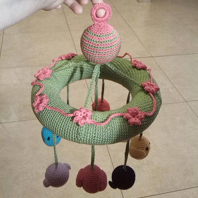 Me inspiré en este trabajo para hacer mi carrusel de pajaritos (y quitar de en medio unas cuantas bolas de poliestireno). Después de hacer todos los colgantes, forré un aro y también lo decoré con una cinta. Aquí hay un pequeño vídeo en Instagram.