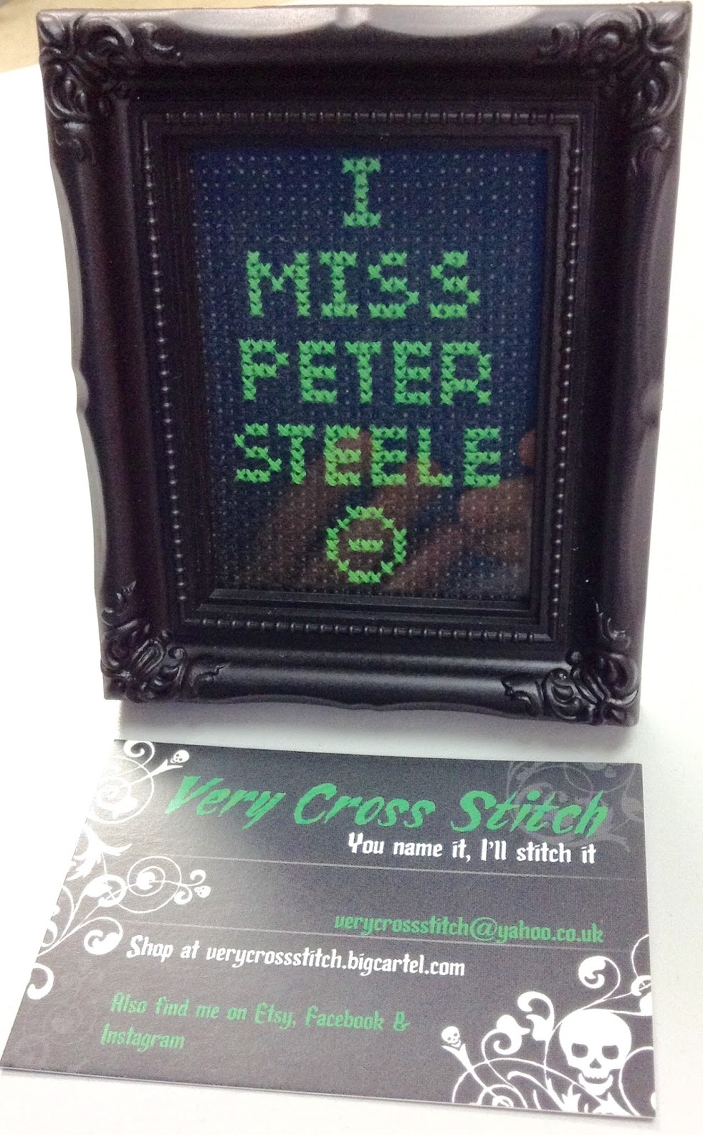 De llegada: el maravillo trabajo a punto de cruz con el lema «I MISS PETER STEELE» (we do!) realizado por Jane @ Very Cross Stitch (Website – Instagram – Etsy). Me enamoré de este pequeño trabajo en cuando lo vi, y ahora está aquí junto a mi pequeño Peter.