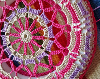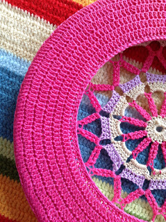 Me encanta trabajar estos diseños tipo mandala, es muy reconfortante. El patrón es Fireworks Mandala de Zelna Olivier. Modifiqué el borde para hacerlo ajustarse al marco de poliestireno y que funcionara como un atrapasueños. El mandala es mucho más fácil de hacer lo que aparenta.