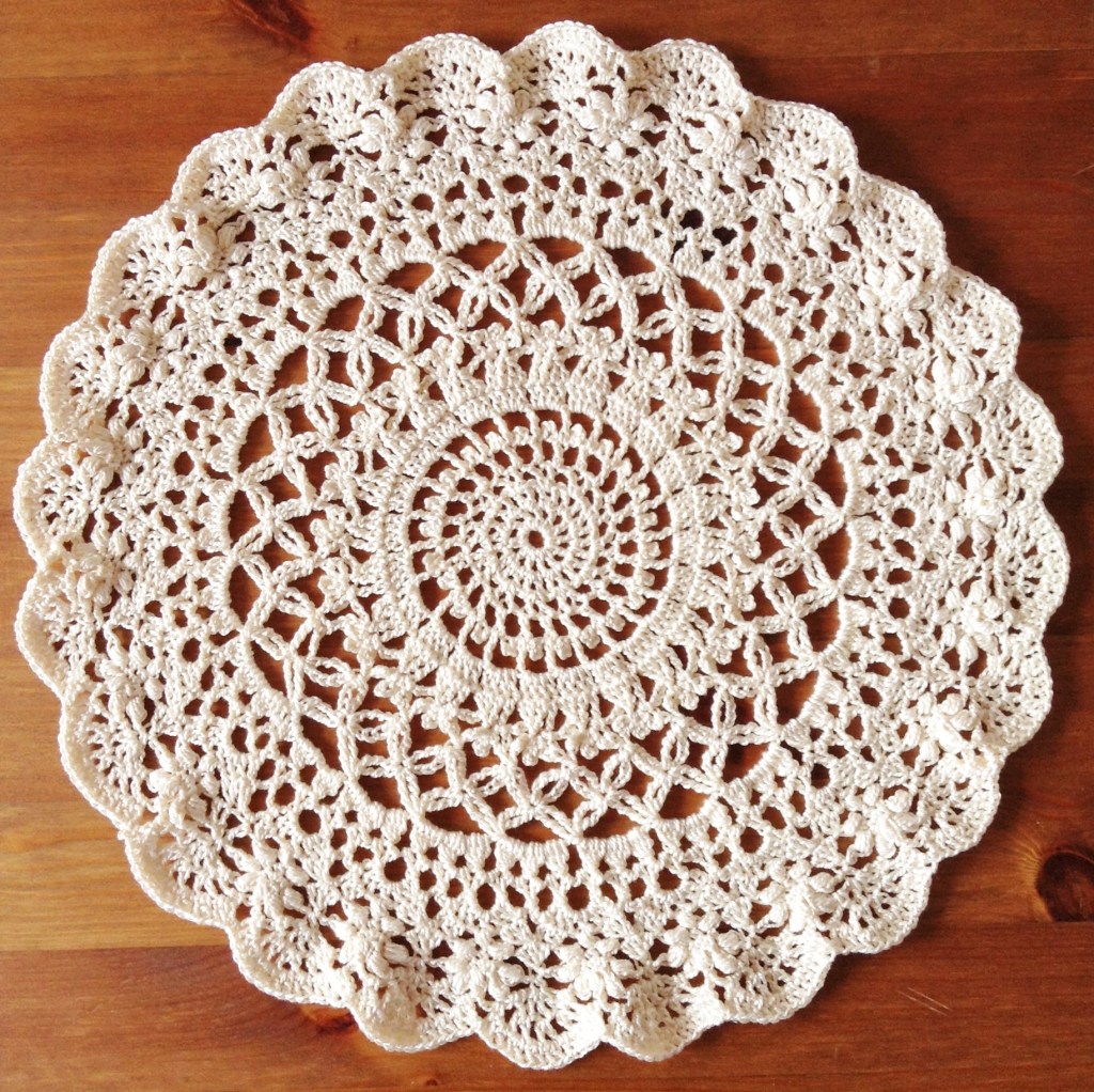 El segundo, en color crudo, es mi primer intento de trabajar con un diseño de tapete «clásico». Está hecho con hilo Anchor Pellicano nº 5 con un gancho de 2 mm. El patrón es Angel’s Garden Doily de Chinami Horiba. Es un poco complicado de hacer, pero puedes encontrar ayuda en Ravelry (aquí y aquí).