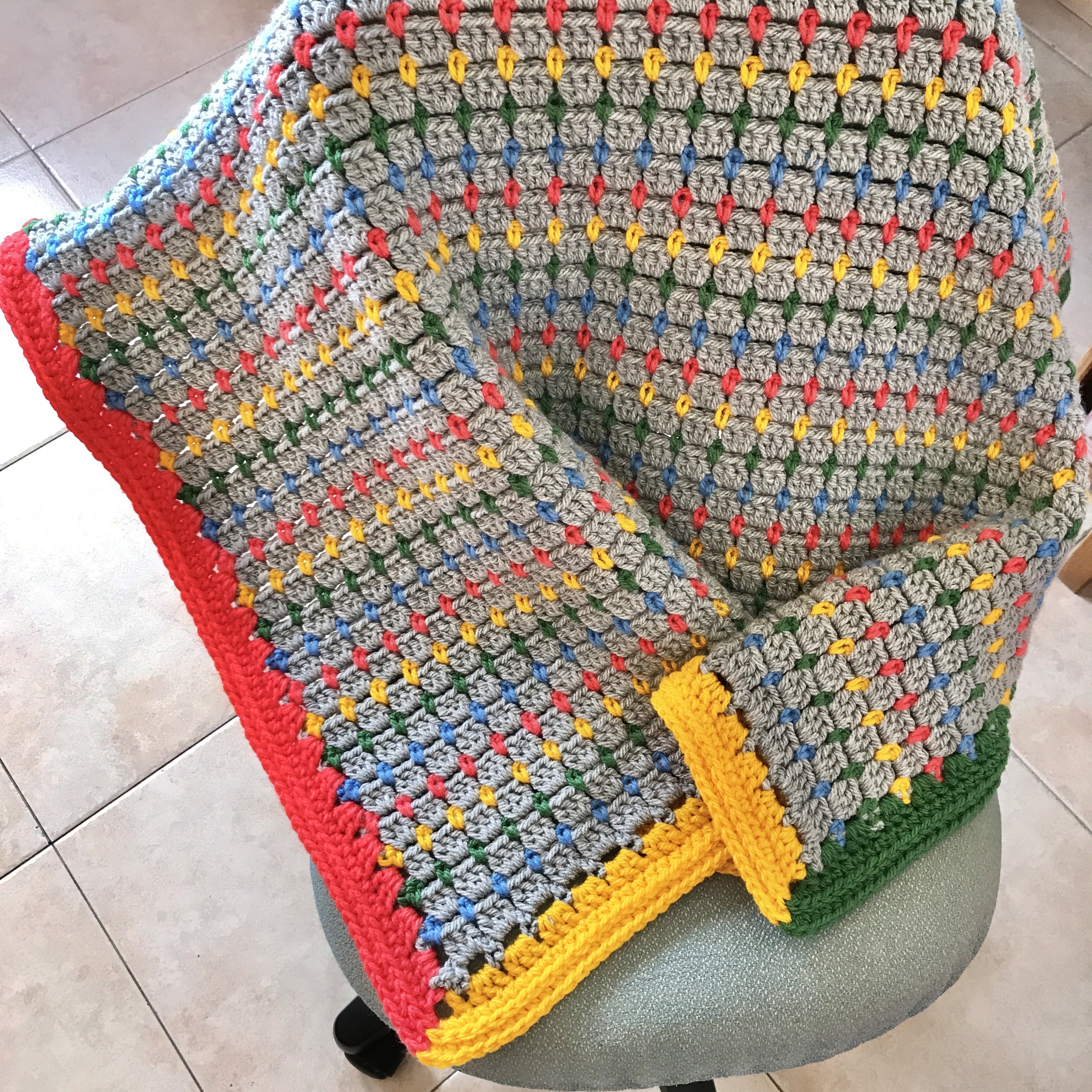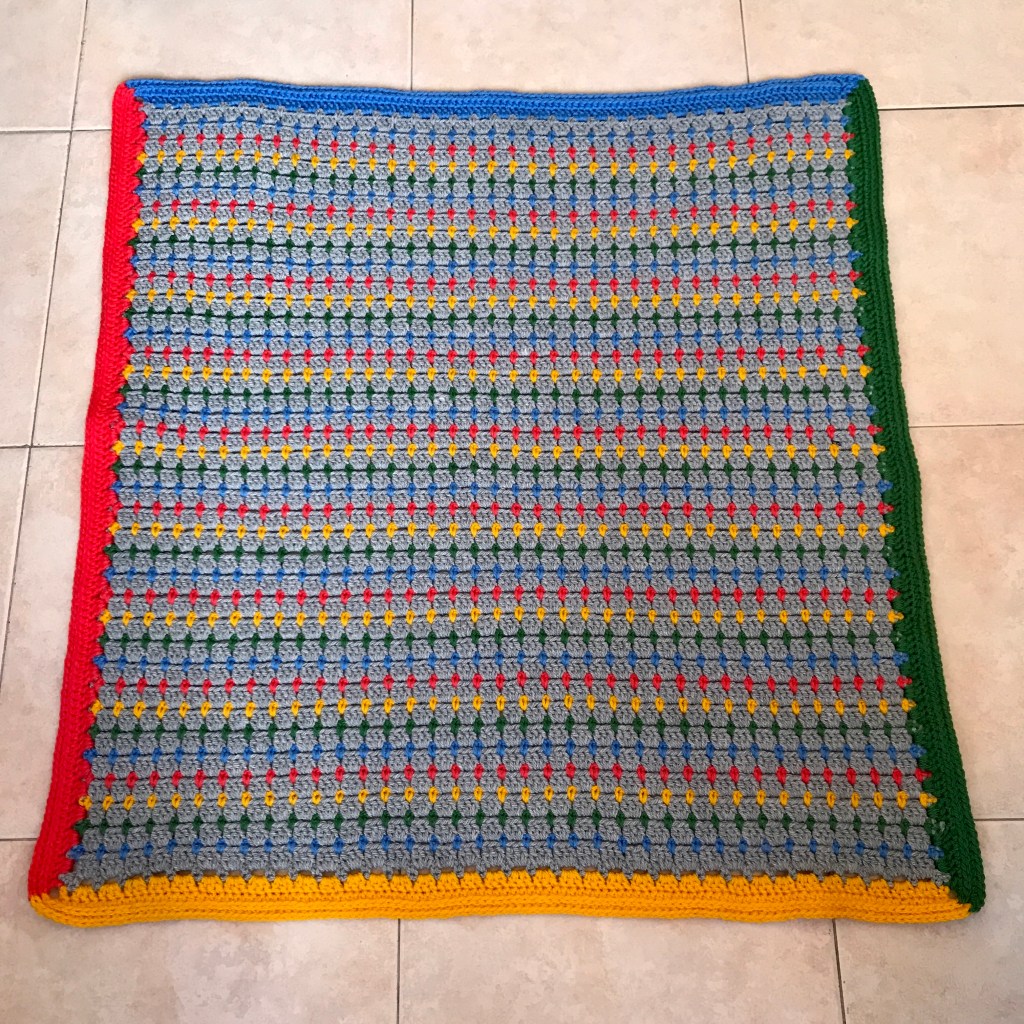 La manta con base en gris y los colores del parchís alternando está hecha según el patrón Hearthside Lapghan Blanket de Jessica Reeves Potasz, al que añadí un borde sencillo alternando los cuatro colores de contraste. Usé un hilo acrílico, el Mondial Pronto.