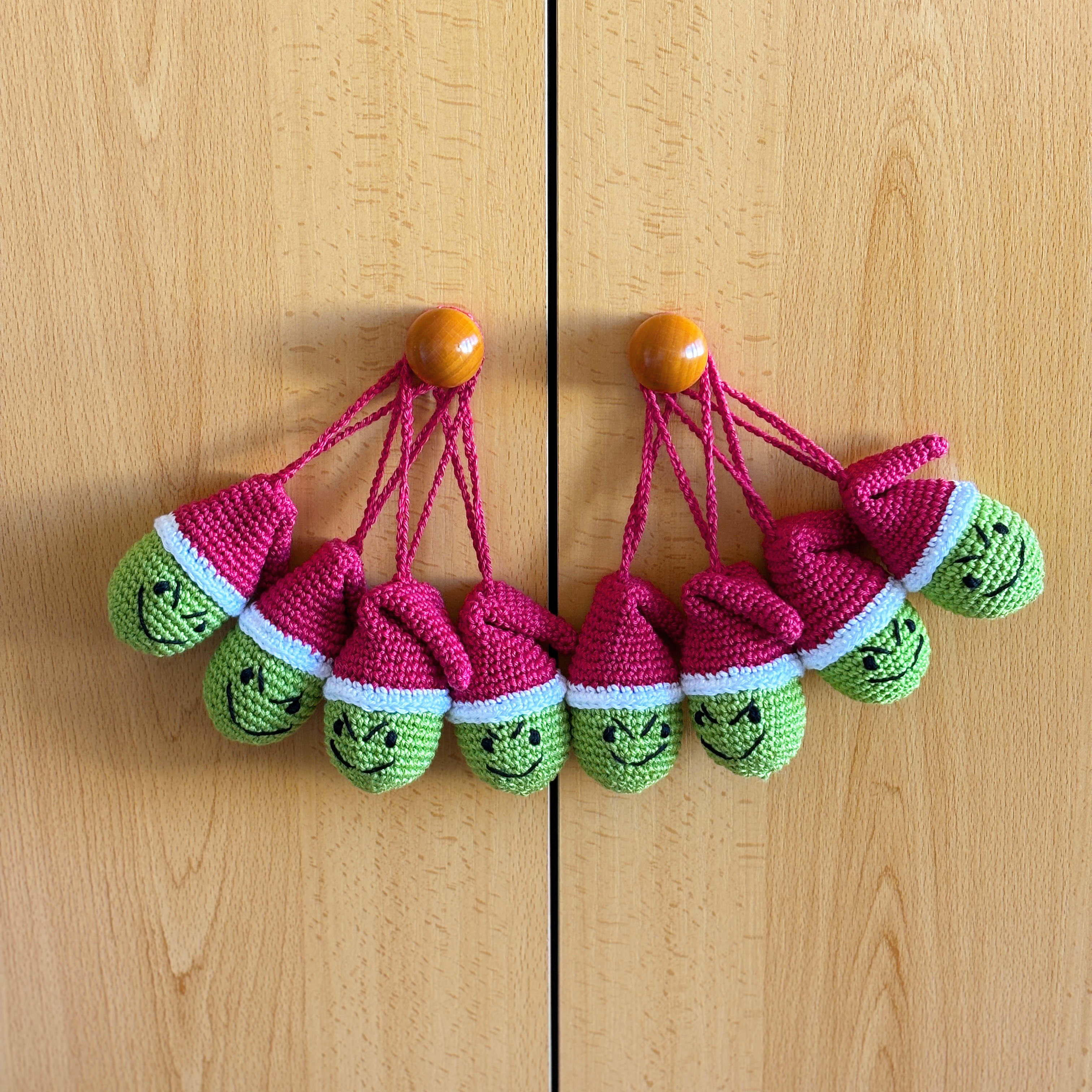 Los grinches están hechos simplemente cubriendo un huevo de poliestireno y añadiendo luego el gorrito.