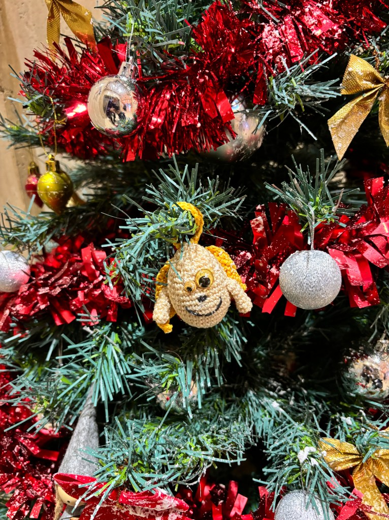 El elfo está hecho con el patrón Elf Ornament de Spin a Yarn Crochet.